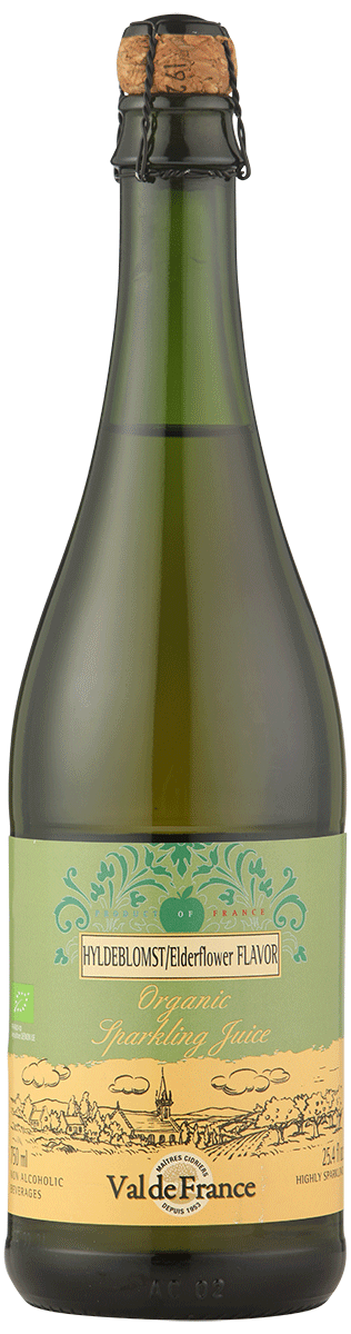 Cider Hyldeblomst uden alkohol - Økologisk - Val de France 75 cl. En fantastisk dejlig cider med hyldeblomstsmag. Den er af høj kvalitet fra Nordfrankrig. Hvis I eller jeres børn er trætte af de søde parfumerede børnechampagner, eller du er gravid, er denne cider bare sagen. Den er sund, smager godt og har rigtig champagne prop
